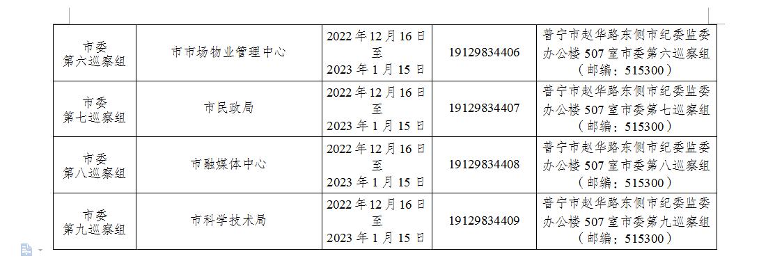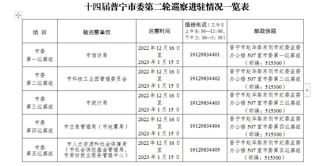 2022年12月15日,普宁市召开十四届市委第二轮巡察动员部署会,市委派出9个巡察组,分别对普宁市科学技术局、民政局、人力资源和社会保障局(市社会保险基金管理局、劳动就业服务管理中心)、应急管理局(市地震局)、统计局、信访局、融媒体中心、科技工业园管理委员会、市场物业管理中心9个单位党组织开展常规巡察工作。