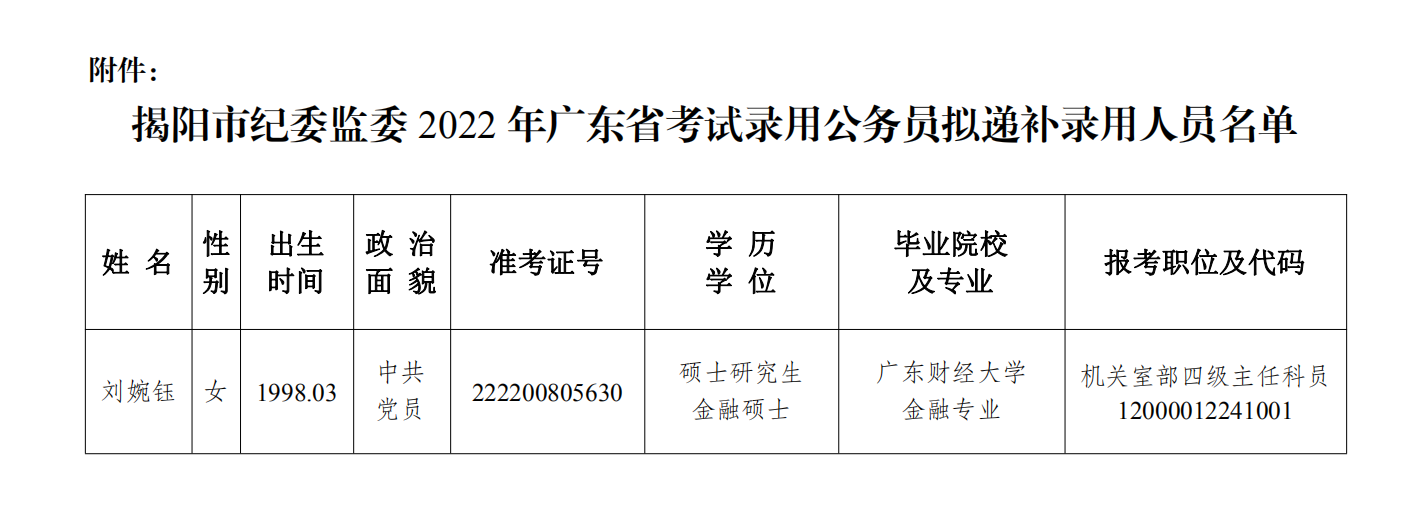附件:揭阳市纪委监委2022年广东省考试录用公务员拟递补录用人员名单