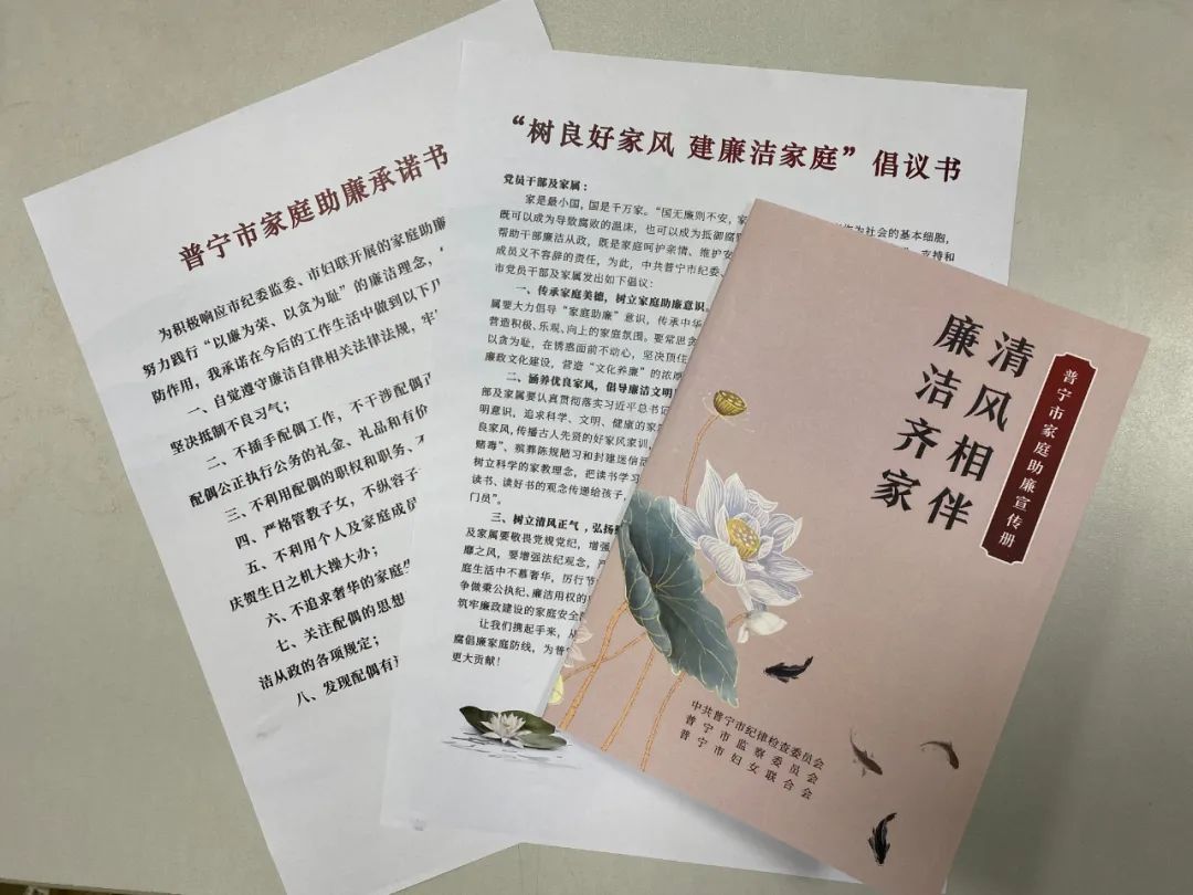举措三:举行一场《家庭助廉宣传册》赠送仪式精心选取习近平总书记关于注重家庭家教家风建设的重要论述,焦裕禄、庄世平等好家风人物事迹以及家规家训、亲情寄语汇编成《家庭助廉宣传册》,并在普宁市廉洁文化基地举行赠送仪式。4000册《家庭助廉宣传册》将赠送给普宁市党员干部家属及普宁市各党支部。