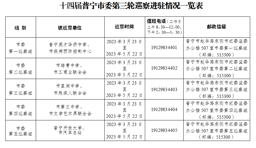 2023年3月20日,普宁市召开全市巡察工作会议暨十四届市委第三轮巡察动员部署会,决定派出9个巡察组,分别对市直属机关工作委员会、市总工会、中国共产主义青年团普宁市委员会、市妇女联合会、市文学艺术界联合会、市工商业联合会、市残疾人联合会、市疾病预防控制中心、普宁开放大学、市第三中学、普宁英才华侨中学、市建新中学、市大长陇中学、市培青中学、市梅峰中学、市里湖中学、市普师高级中学、市汽车总站等18个单位党组织开展常规巡察。本轮巡察进驻时间为2023年3月23日至5月22日。