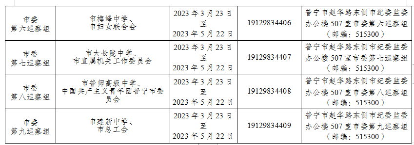 进驻期间,各巡察组分别设立专门值班电话和联系信箱,主要受理反映被巡察单位领导班子及其成员、下一级党组织领导班子主要负责人问题的来信来电来访,重点是违反政治纪律、组织纪律、廉洁纪律、群众纪律、工作纪律和生活纪律等方面的举报和反映。其他非巡察范围内的个人诉求、涉法涉诉等信访问题,将按照分级负责、属地管理的原则,移交被巡察单位和有关部门处理。