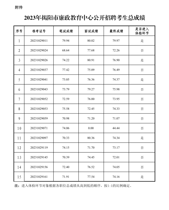 根据《2023年揭阳市廉政教育中心公开招聘工作人员公告》有关规定,现将考生总成绩和体检有关事项公布如下: