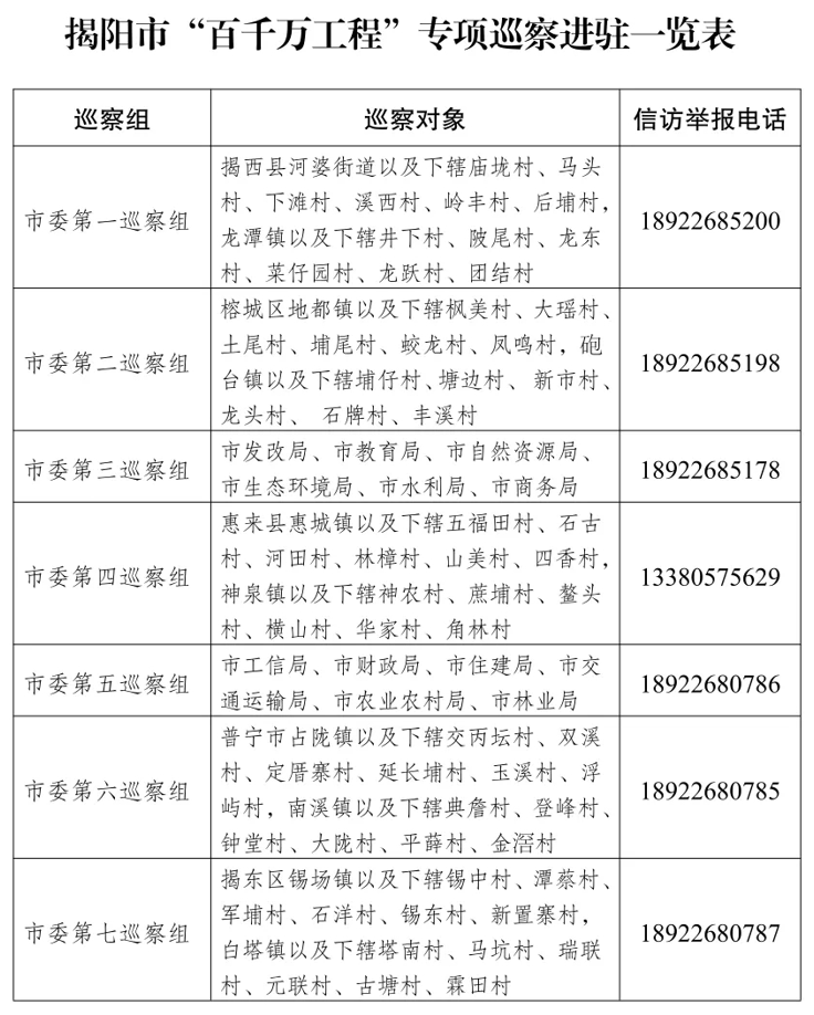 为深入贯彻落实习近平总书记视察广东重要讲话重要指示精神,进一步推进深入实施“百千万工程”,市委决定派出2个巡察组对市发改局、市教育局、市工信局、市财政局、市自然资源局、市生态环境局、市住建局、市交通运输局、市水利局、市农业农村局、市商务局、市林业局等12个市直部门开展“百千万工程”专项巡察,派出5个巡察组对榕城区地都镇、砲台镇,揭东区锡场镇、白塔镇,普宁市占陇镇、南溪镇,揭西县河婆街道、龙潭镇,惠来县惠城镇、神泉镇等10个镇街以及所辖60个村居提级开展“百千万工程”专项巡察,进驻时间从2024年3月下旬至6月中旬。