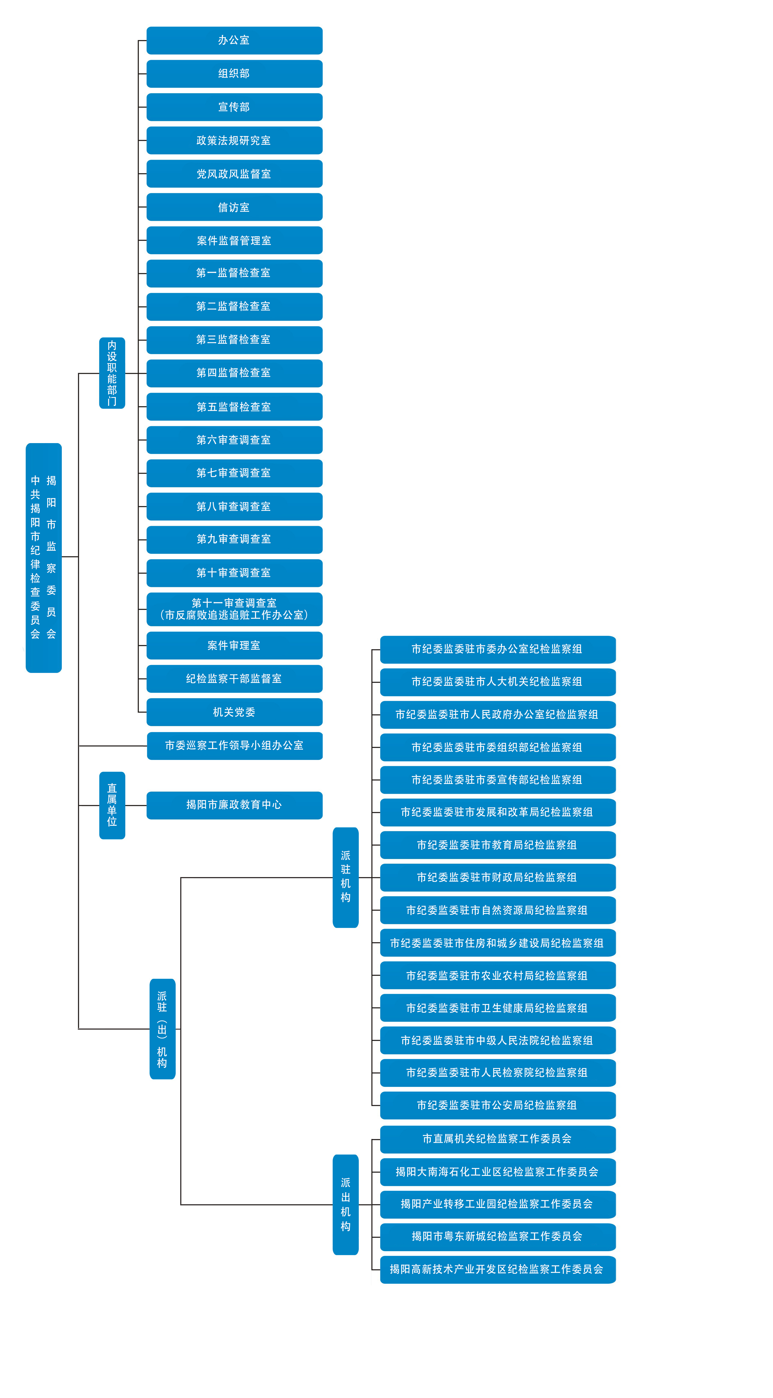 中共揭阳市纪律检查委员会和揭阳市监察委员会合署办公。目前,内设职能部门21个,即办公室、组织部、宣传部、政策法规研究室、党风政风监督室、信访室、案件监督管理室、第一至第五监督检查室、第六至第十一审查调查室、案件审理室、纪检监察干部监督室、机关党委;市委巡察工作领导小组办公室;直属单位1个,即揭阳市廉政教育中心;派驻机构15个,即市纪委监委驻市委办公室纪检监察组、市纪委监委驻市人大机关纪检监察组、市纪委监委驻市人民政府办公室纪检监察组、市纪委监委驻市委组织部纪检监察组、市纪委监委驻市委宣传部纪检监察组、市纪委监委驻市发展和改革局纪检监察组、市纪委监委驻市教育局纪检监察组、市纪委监委驻市财政局纪检监察组、市纪委监委驻市自然资源局纪检监察组、市纪委监委驻市住房城乡和建设局纪检监察组、市纪委监委驻市农业农村局纪检监察组、市纪委监委驻市卫生健康局纪检监察组、市纪委监委驻市中级人民法院纪检监察组、市纪委监委驻市人民检察院纪检监察组、市纪委监委驻市公安局纪检监察组;派出机构5个,即市直属机关纪检监察工作委员会、揭阳大南海石化工业区纪检监察工作委员会、揭阳产业转移工业园纪检监察工作委员会、揭阳市粤东新城纪检监察工作委员会、揭阳高新技术产业开发区纪检监察工作委员会。